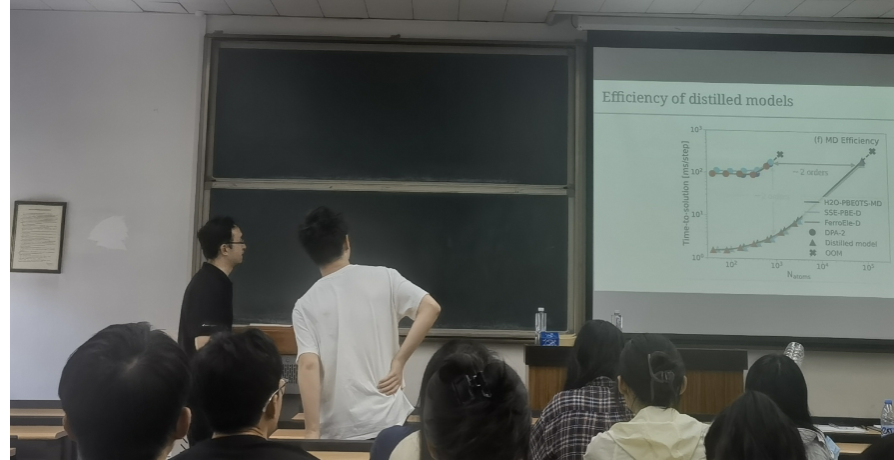 王涵研究员首先科普了原子模型的发展历史,从约翰·道尔顿的原子理论到量子力学的建立,以及现代微观模拟方法面临的挑战;紧接着,介绍了机器学习在原子尺度模拟中的应用,并讨论了现有机器学习模型的局限性;随后,分享了DPA-2大原子模型(Large Atomic Model, LAM)的模型架构、训练方法、微调策略以及模型知识蒸馏方法,并展示了DPA-2的少数帧泛化能力及其在现实世界应用中的准确性。在报告的最后,王涵研究员介绍了“OpenLAM倡议”——一个旨在推动大原子模型发展的开源计划,并热诚、开放地欢迎来自各方的意见和支持。