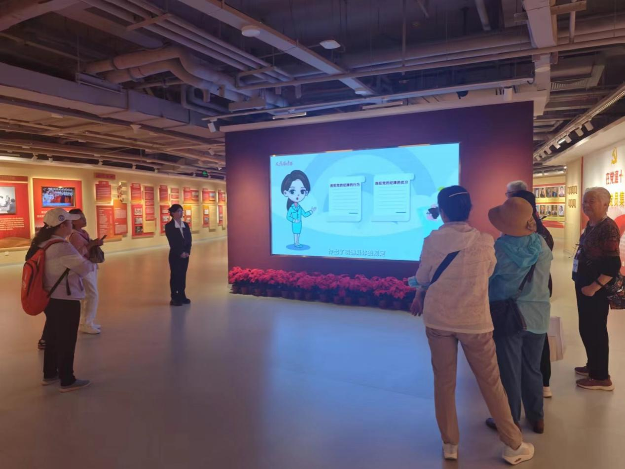 参观开始,讲解员通过大屏幕播放了党纪教育的学习视频,老同志们驻足观看,通过播放的动画对新修订的《中国共产党纪律处分条例》进行了深入学习,进一步严明党的政治纪律和政治规矩,带动各项纪律全面从严,不断增强自我净化、自我完善、自我革新、自我提高能力。