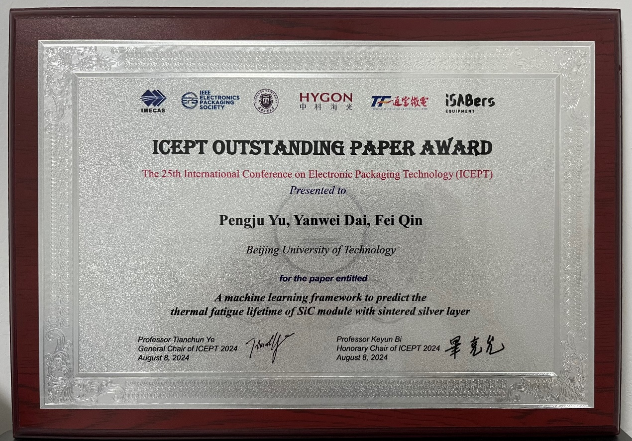 第25届电子封装技术国际会议(IEEE-ICEPT 2024)于2024年8月7日至9日在天津市社会山国际会议中心举行。公司力学系秦飞教授课题组提交的两篇论文《A Machine Learning Framework to Predict the Thermal Fatigue Lifetime of SiC Module with Sintered Silver Layer》(第一作者为2022级硕士生于鹏举,秦飞教授和代岩伟副教授为论文共同通讯作者)、《Heat Dissipation Optimization Study of Active Phased Array Antenna Microchannel》(第一作者为2020级博士生史戈,秦飞教授为论文通讯作者, 2022级硕士生杨光和代岩伟副教授为论文第三和第四作者)分别荣获大会杰出论文奖(Outstanding Paper Award)和优秀员工论文奖(Best Student Paper Award)。秦飞教授课题组多年来始终聚焦国家集成电路封装领域的关键问题,持续深入开展集成电路封装技术可靠性和力学领域的交叉创新研究工作,已有十余篇论文被评为国际、国内封装和力学等领域权威会议的优秀论文,研究成果获得广泛认可。