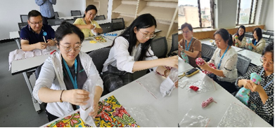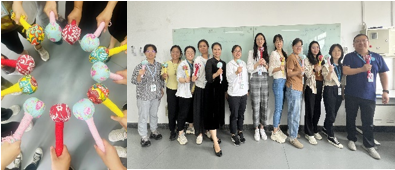 老师们积极参与,享受DIY的乐趣。大家了解了制作过程后,纷纷动手实践,过程中不断分享着制作技巧。“一定要把中药包尽量捏圆捏实些”,“系绳子可是力气活儿,越紧实越好”……大家边交流边制作,一个个漂亮的养生锤制作完成,老师们脸上露出满足和幸福的笑容。大家纷纷用自己制作的养生锤敲打肩膀、腰部等,感觉很舒服,很是满意。