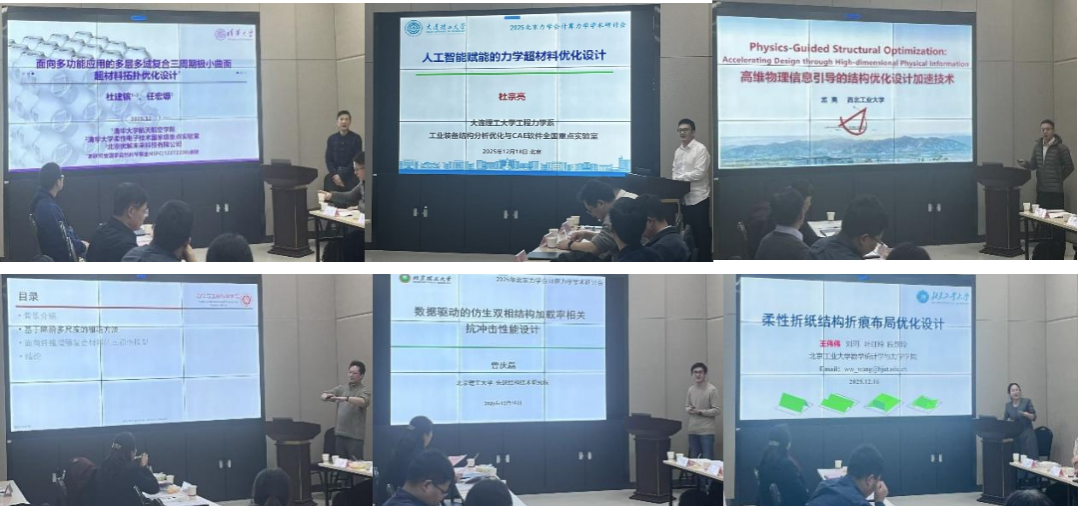 报告环节由yl9193永利集团龙连春教授主持。清华大学杜建镔长聘副教授、大连理工大学杜宗亮教授、西北工业大学孟亮长聘副教授、北京大学袁子峰特聘研究员、北京理工大学曾庆磊长聘副教授和yl9193永利集团王伟伟助理研究员分别做题为《面向多功能应用的多层多域复合三周期极小曲面超材料拓扑优化设计》《人工智能赋能的力学超材料优化设计》《高维物理信息引导的结构优化设计加速技术》《面向纤维增强复合材料失效模拟的三损伤耦合计算方法》《数据驱动的仿生双相结构加载率相关抗冲击性能设计》和《柔性折纸结构折痕布局优化设计》的特邀报告。报告内容涵盖了超材料设计、人工智能辅助优化、多尺度计算、复合材料失效分析等多个前沿方向,充分展示了计算力学领域的创新活力与发展潜力。