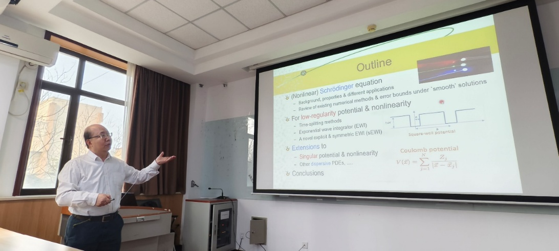 包维柱教授以薛定谔方程为切入点,系统阐述了该方程的背景、性质及多样化应用场景,聚焦带有低正则势函数与非线性项的薛定谔方程,设计了时间分裂和指数积分因子等方法,可进一步推广至带有含时低正则/奇异势函数以及奇异非线性项的薛定谔方程和其他色散方程中,为低正则偏微分方程的数值解法研究及相关领域的创新发展提供广阔思路。