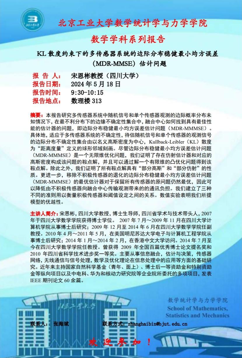 【数统力|学术报告】——KL散度约束下的多传感器系统的边际分布稳健最小均方误差(MDR-MMSE)估计问题