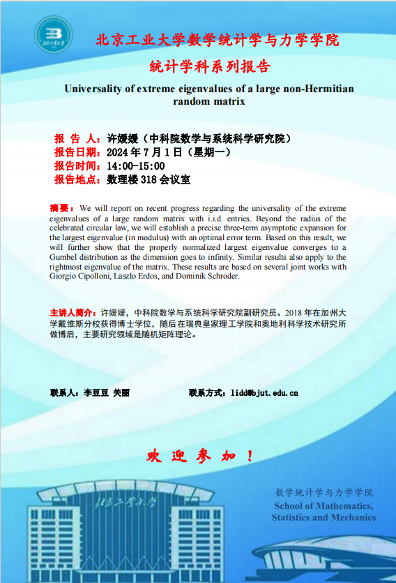 【数统力|学术报告】——Universality of extreme eigenvalues of a large non-Hermitian random matrix