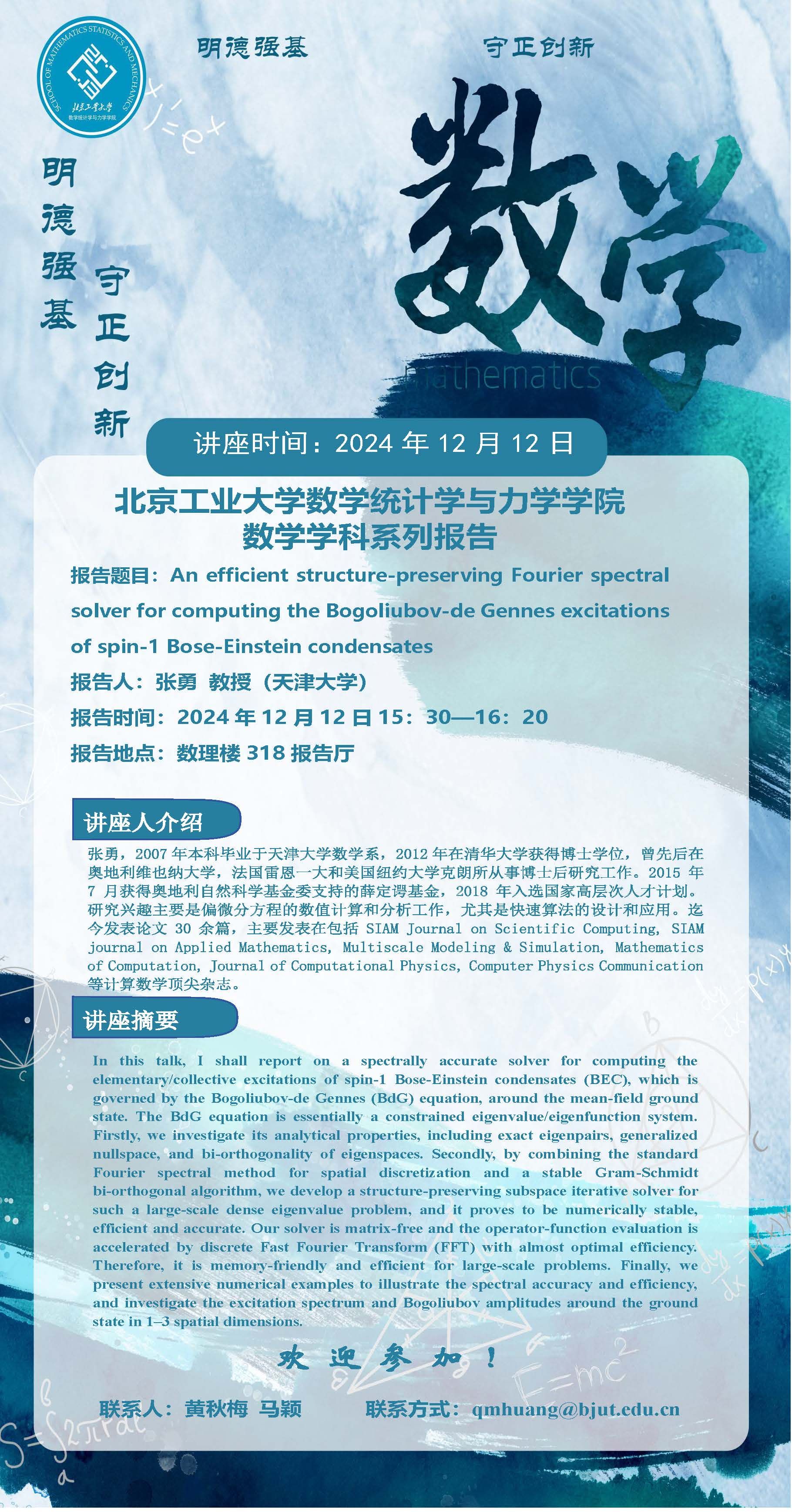 【数统力|学术报告】——An efficient structure-preserving Fourier spectral solver for computing the Bogoliubov-de Gennes excitations of spin-1 Bose-Einstein condensates