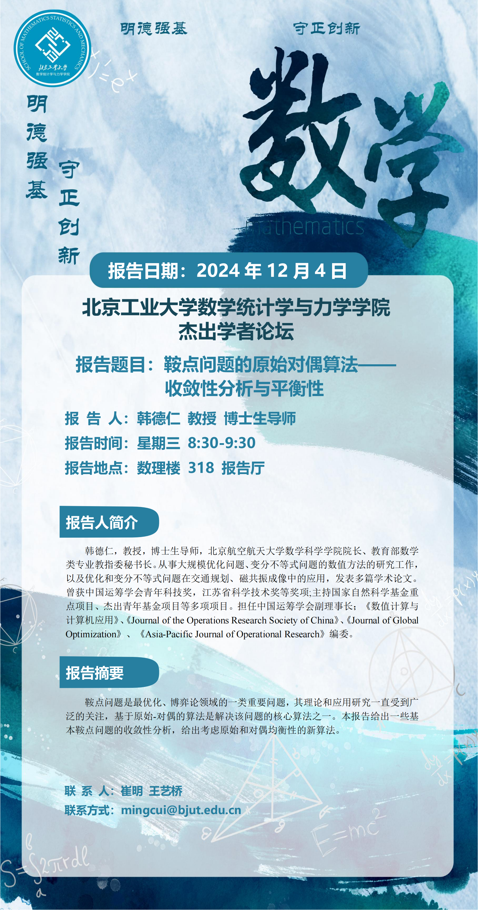 【数统力|学术报告】——杰出学者论坛“鞍点问题的原始对偶算法-收敛性分析与平衡性”