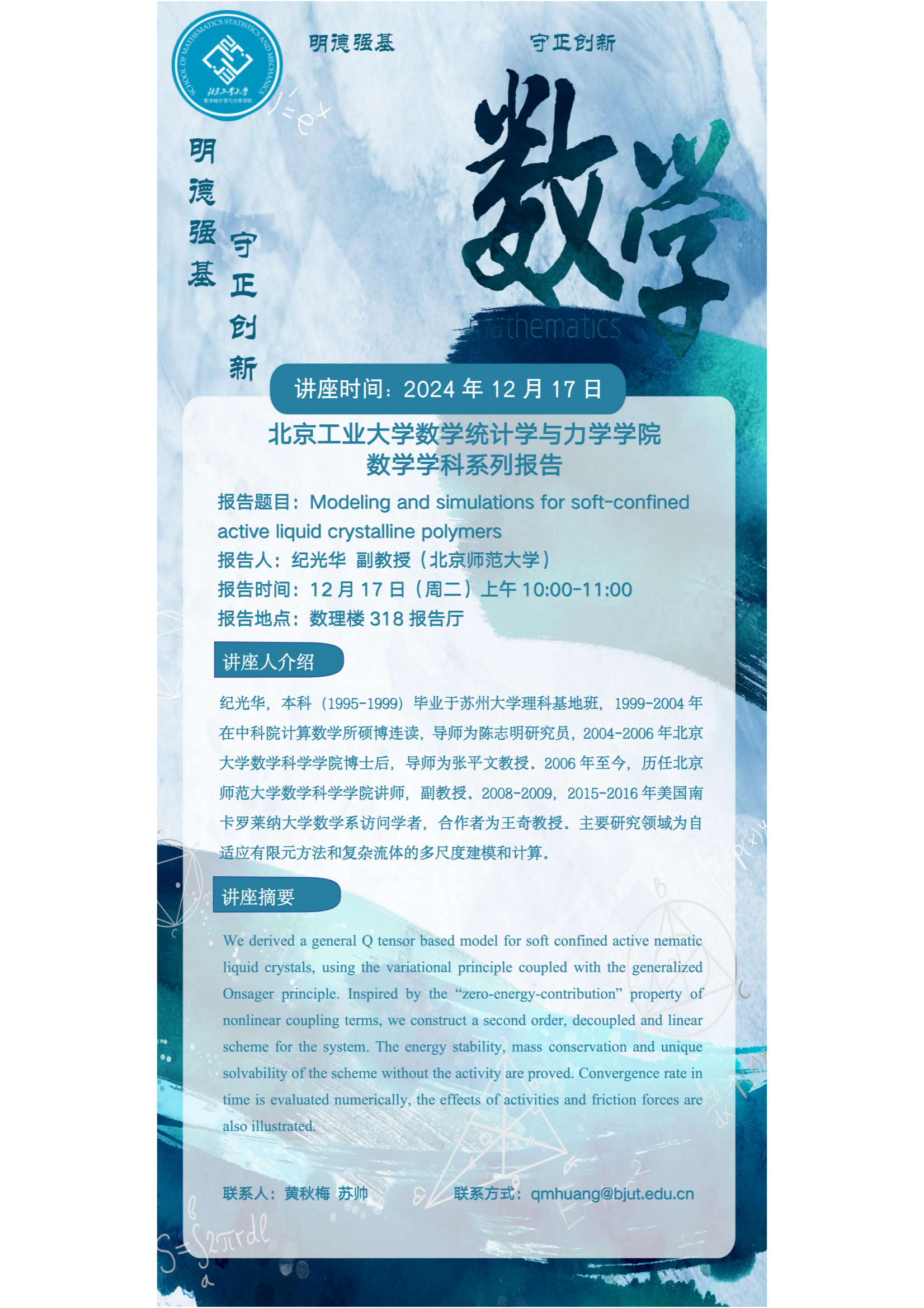 【数统力|学术报告】——Modeling and simulations for soft-confined active liquid crystalline polymers