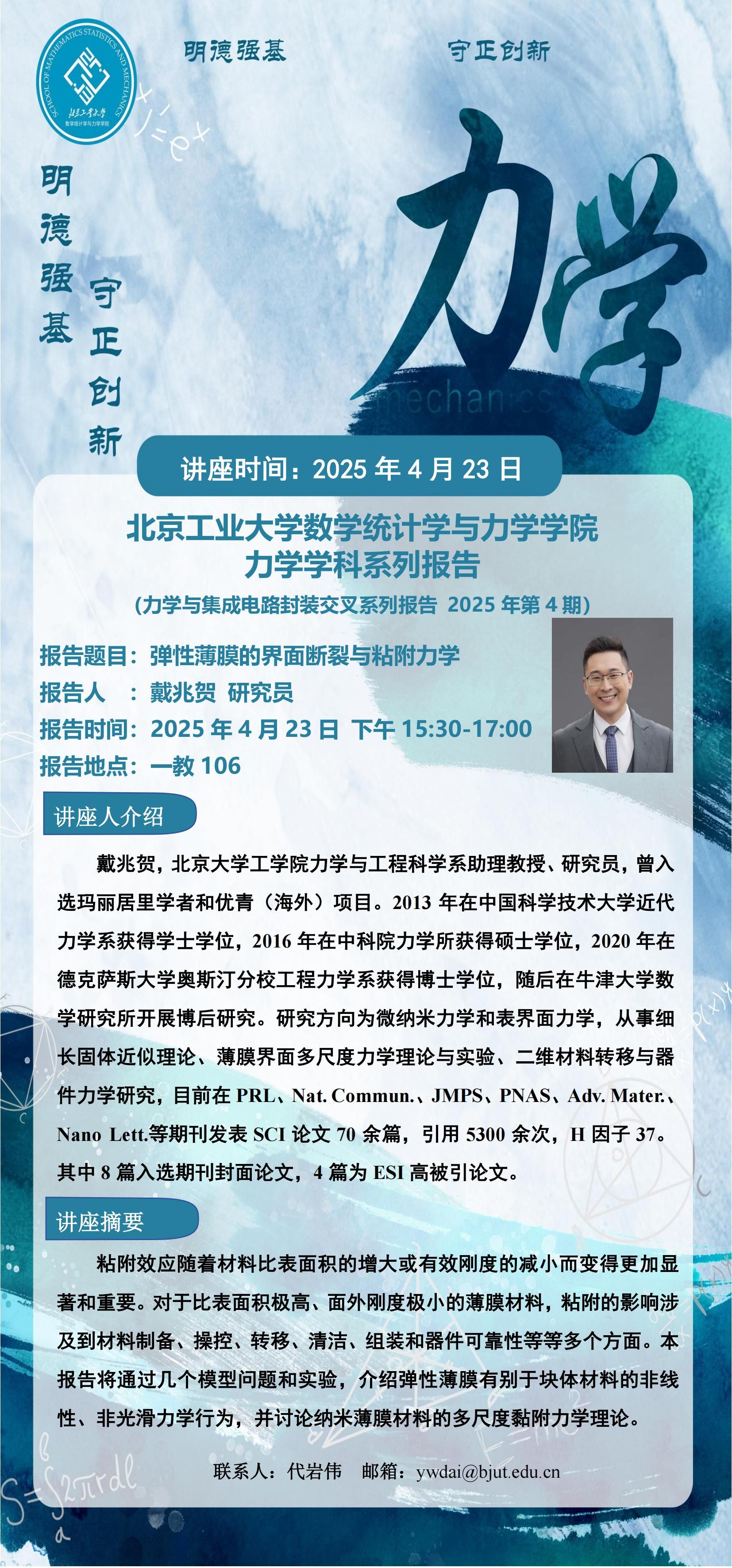 【数统力|学术报告】——弹性薄膜的界面断裂与粘附力学