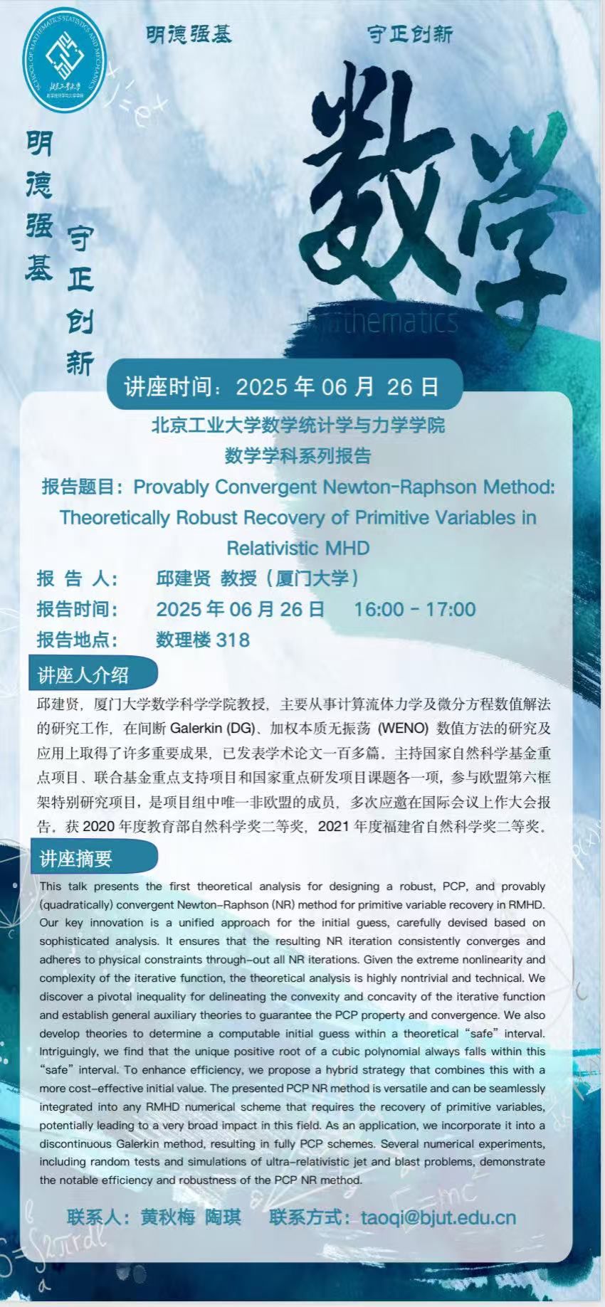 【数统力|学术报告】——Provably Convergent Newton-Raphson Method:Theoretically Robust Recovery of Primitive Variables in Relativistic MHD