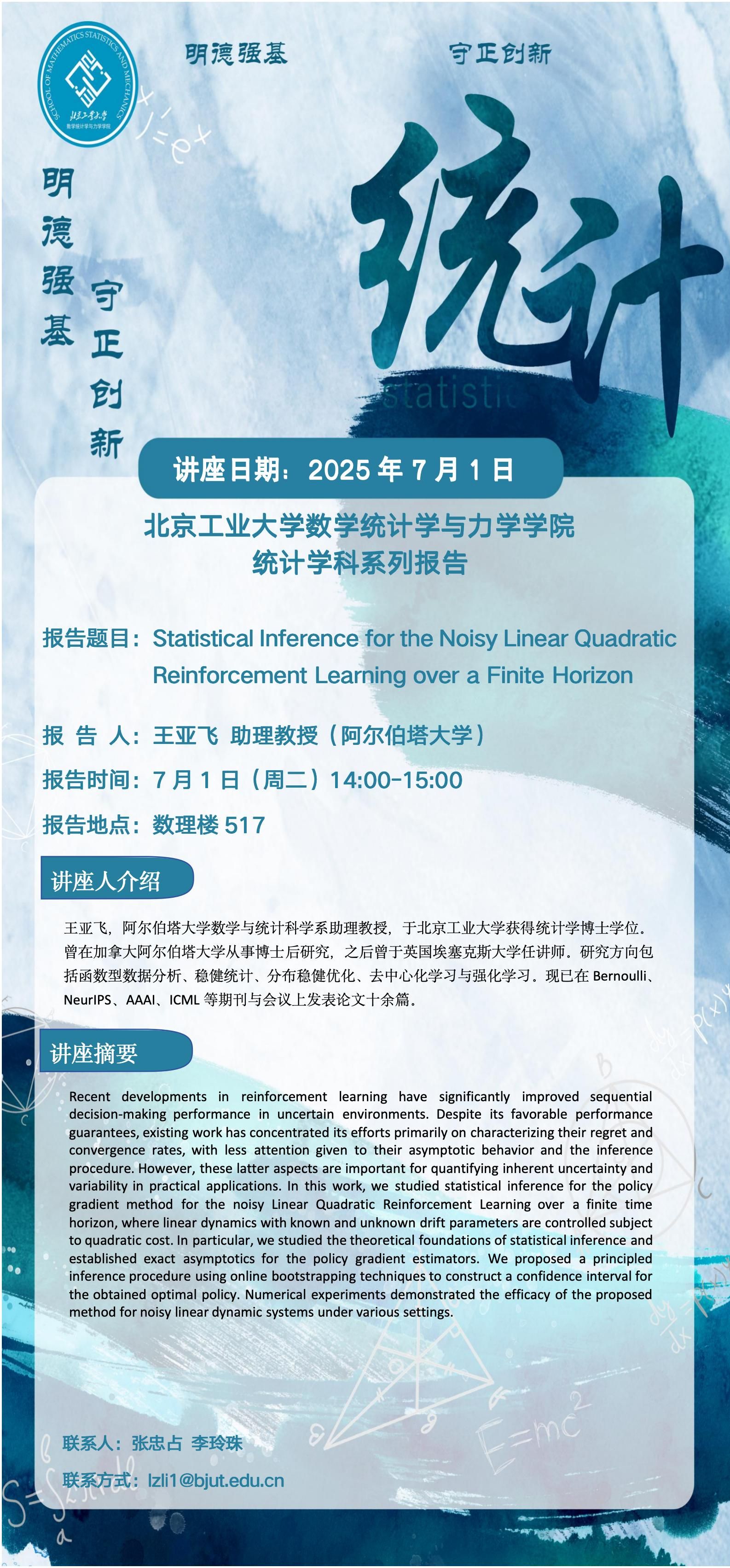 【数统力|学术报告】——Statistical Inference for the Noisy Linear Quadratic Reinforcement Learning over a Finite Horizon
