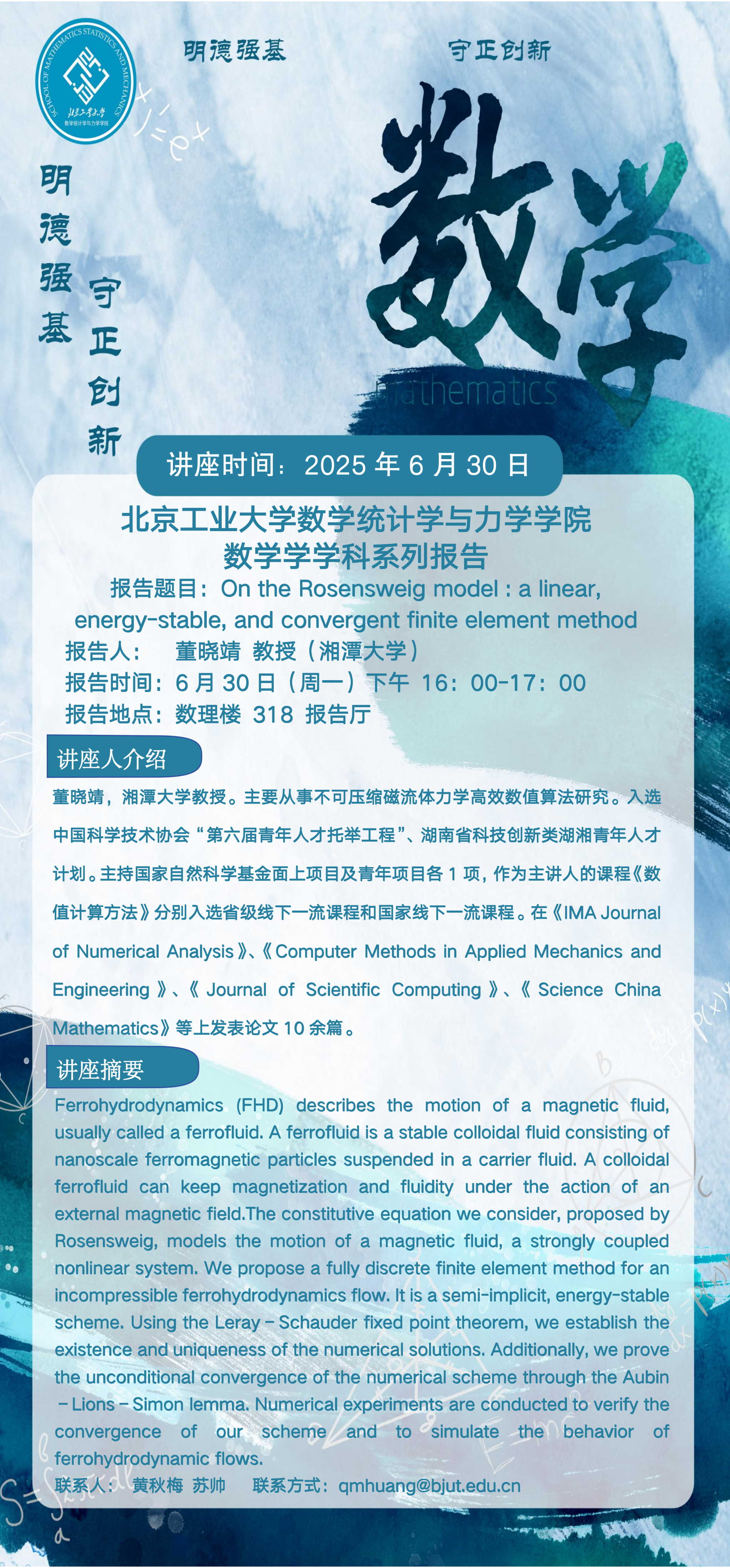 【数统力|学术报告】——On the Rosensweig model: a linear, energy-stable, and convergent finite element method
