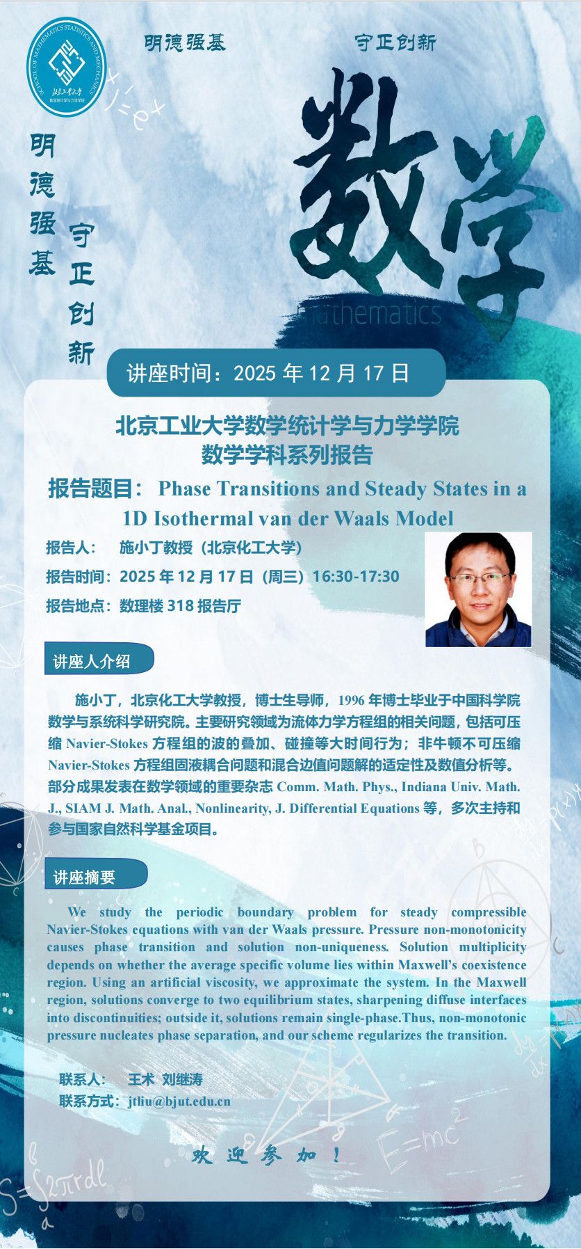 【数统力|学术报告】Phase Transitions and Steady States in a 1D Isothermal van der Waals Model