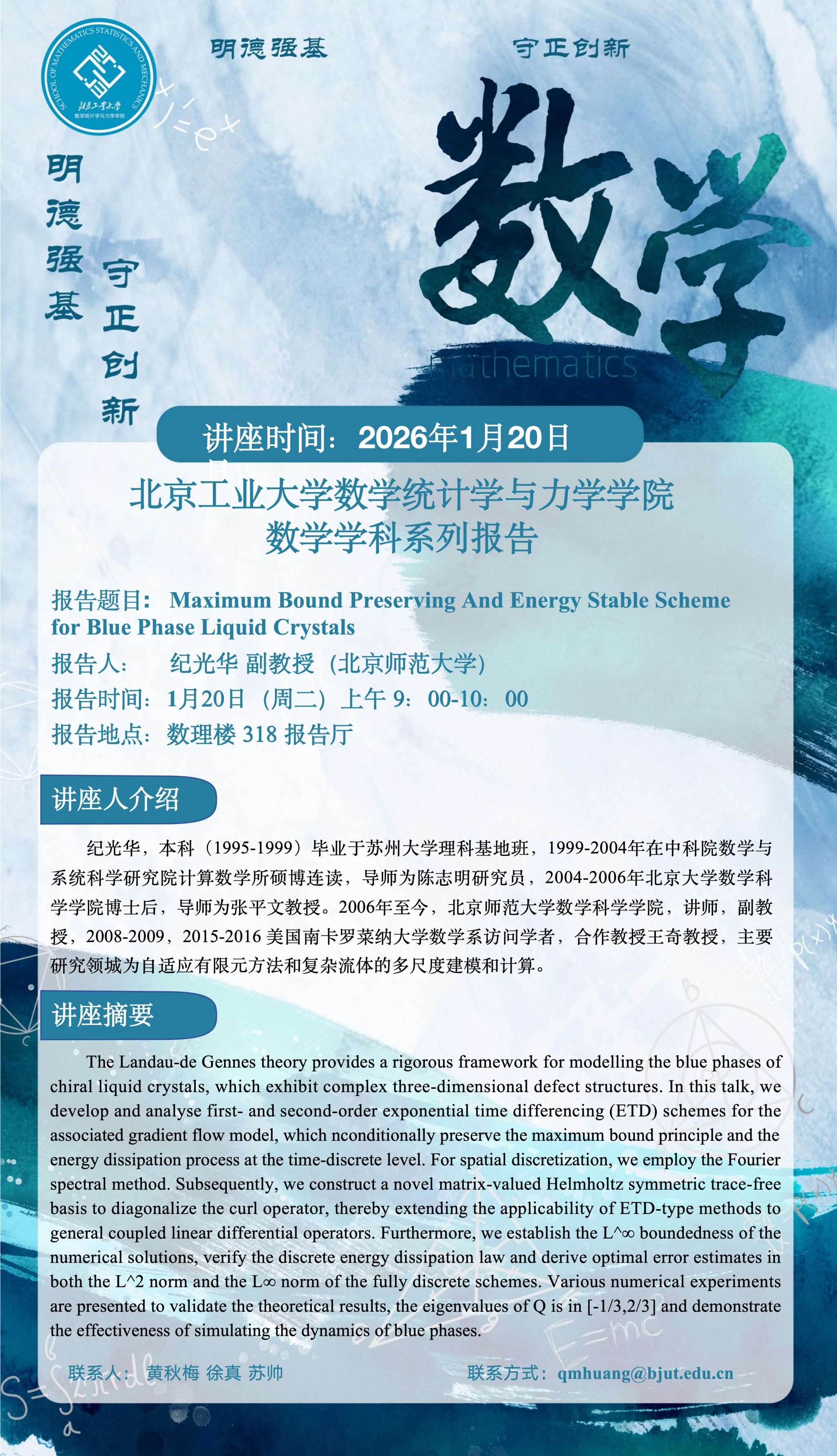 【数统力|学术报告】Maximum Bound Preserving And Energy Stable Scheme for Blue Phase Liquid Crystals